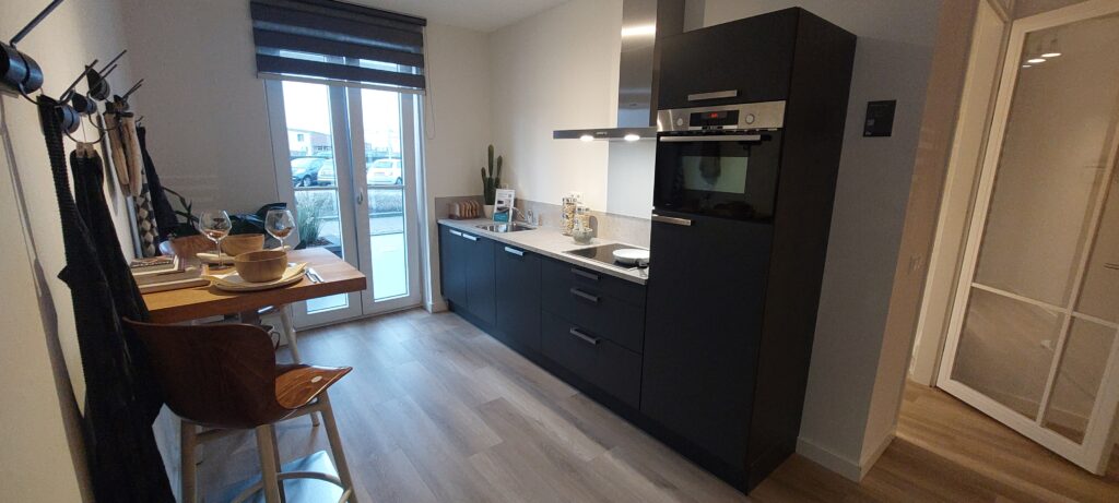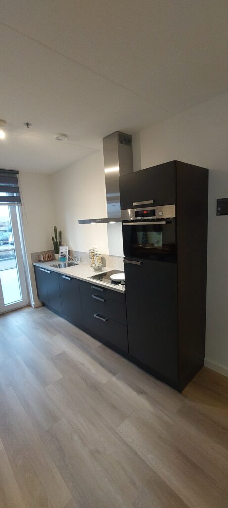 Een compacte keuken in rechte opstelling. Deze keuken is uitgevoerd in de kleur grafiet en heeft een Greengridz werkblad.